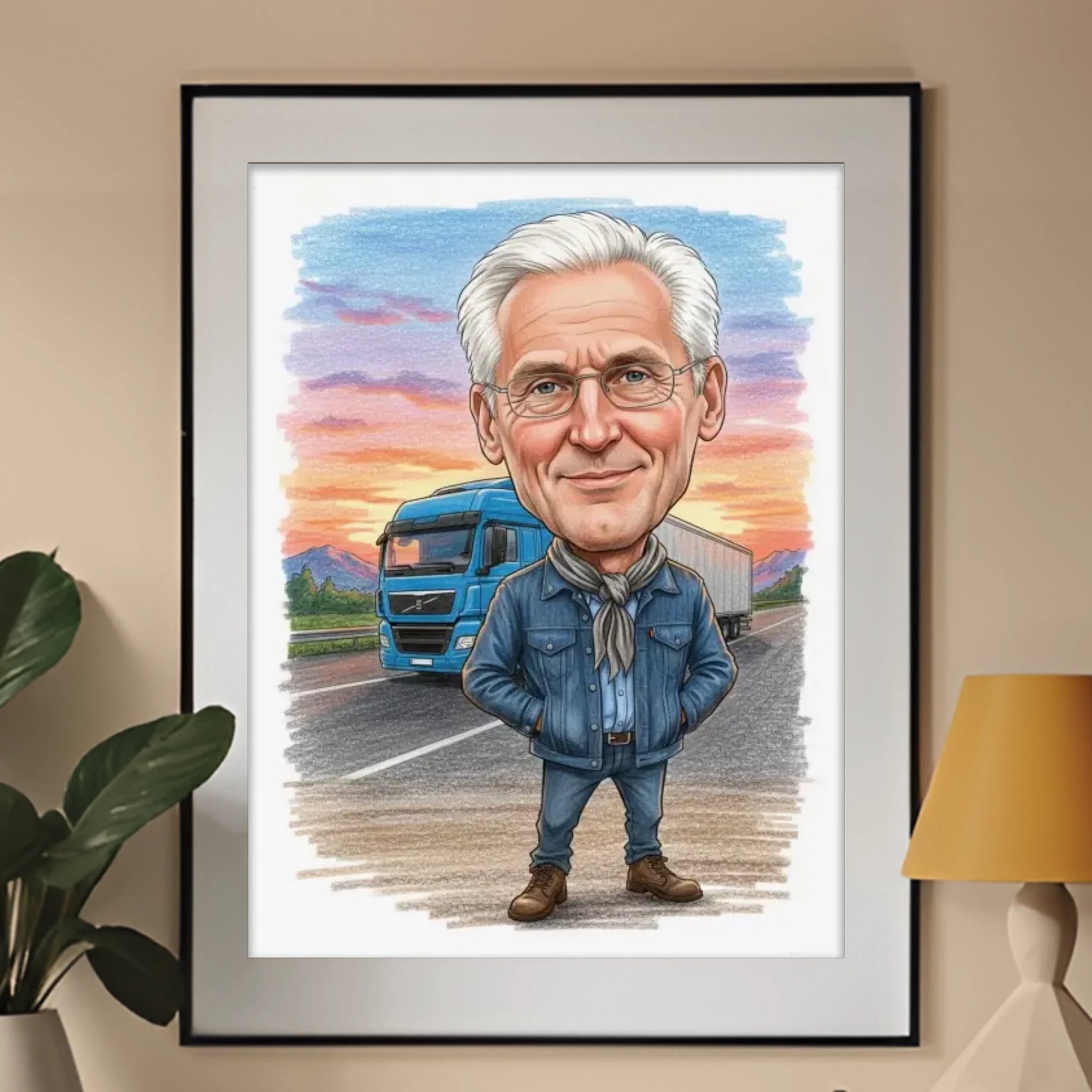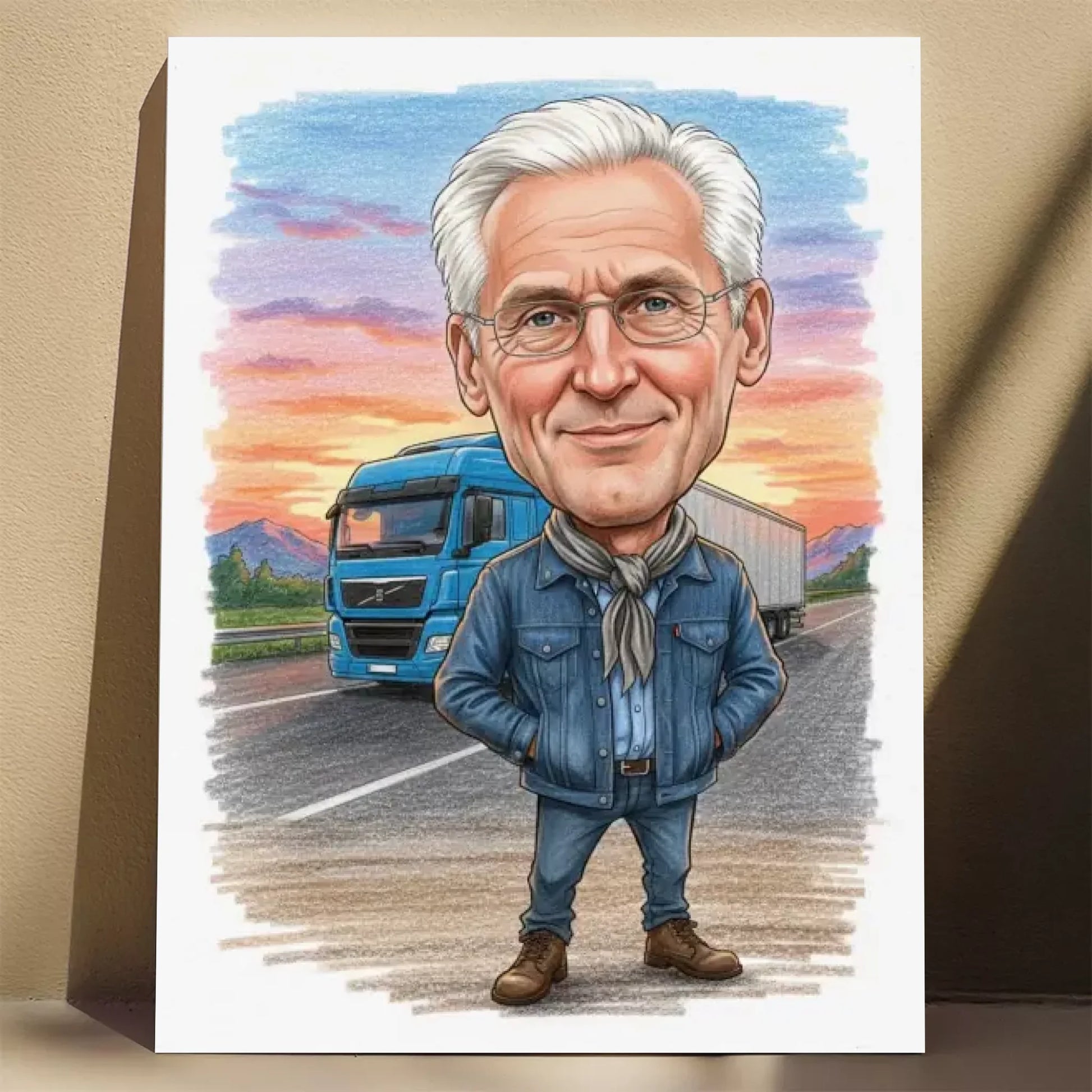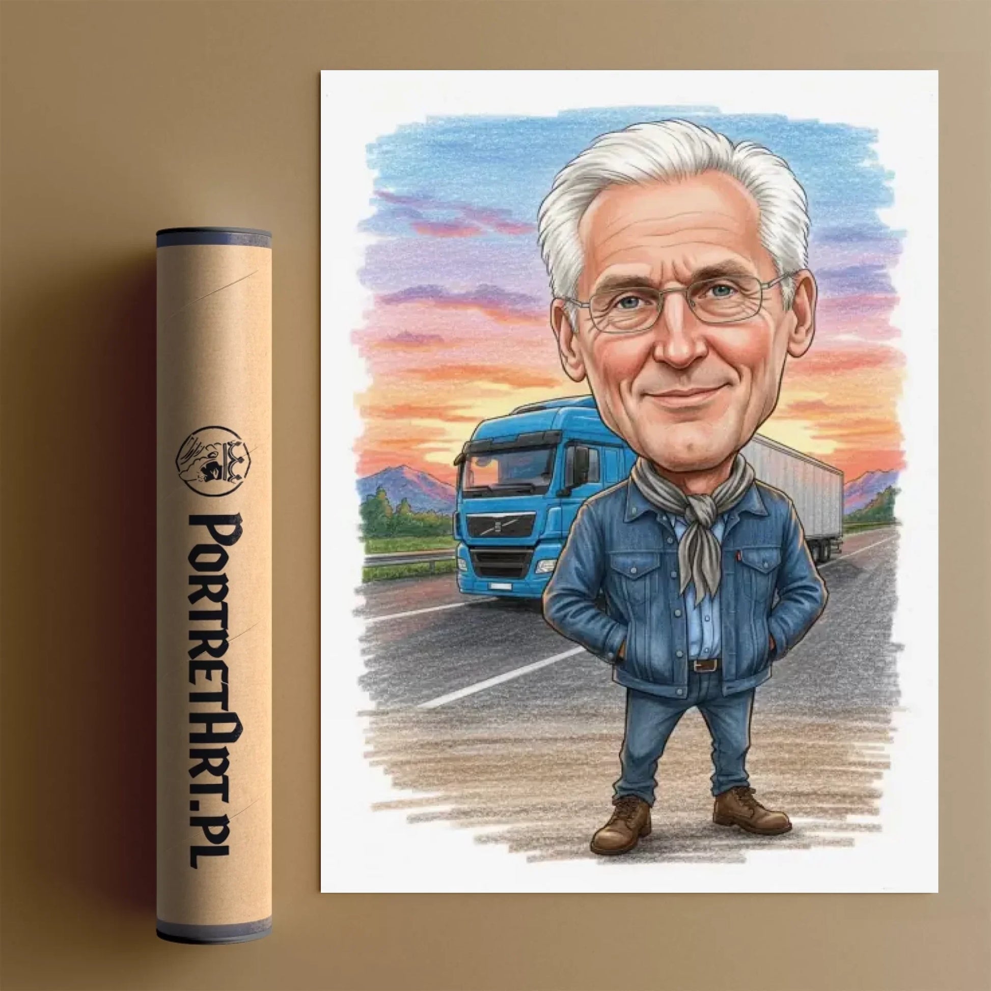 Karykatura „Kierowca ciężarówki” to wyjątkowy sposób, by uhonorować pasję i ciężką pracę każdego kierowcy. 🚛 Zamień zdjęcie w cyfrową ilustrację, która odda charakter zawodowca za kółkiem – z humorem i dumą z zawodu. Na karykaturze kierowca pozuje przy swojej ciężarówce, w klasycznej czapce lub kamizelce, na tle drogi lub parkingu. Idealny prezent dla kierowcy tira, kuriera lub fana motoryzacji. Dodaj zdjęcie, zobacz podgląd karykatury LIVE i wybierz format – plakat, płótno lub ramka. Polska produkcja, szybka wysyłka, gwarancja satysfakcji.