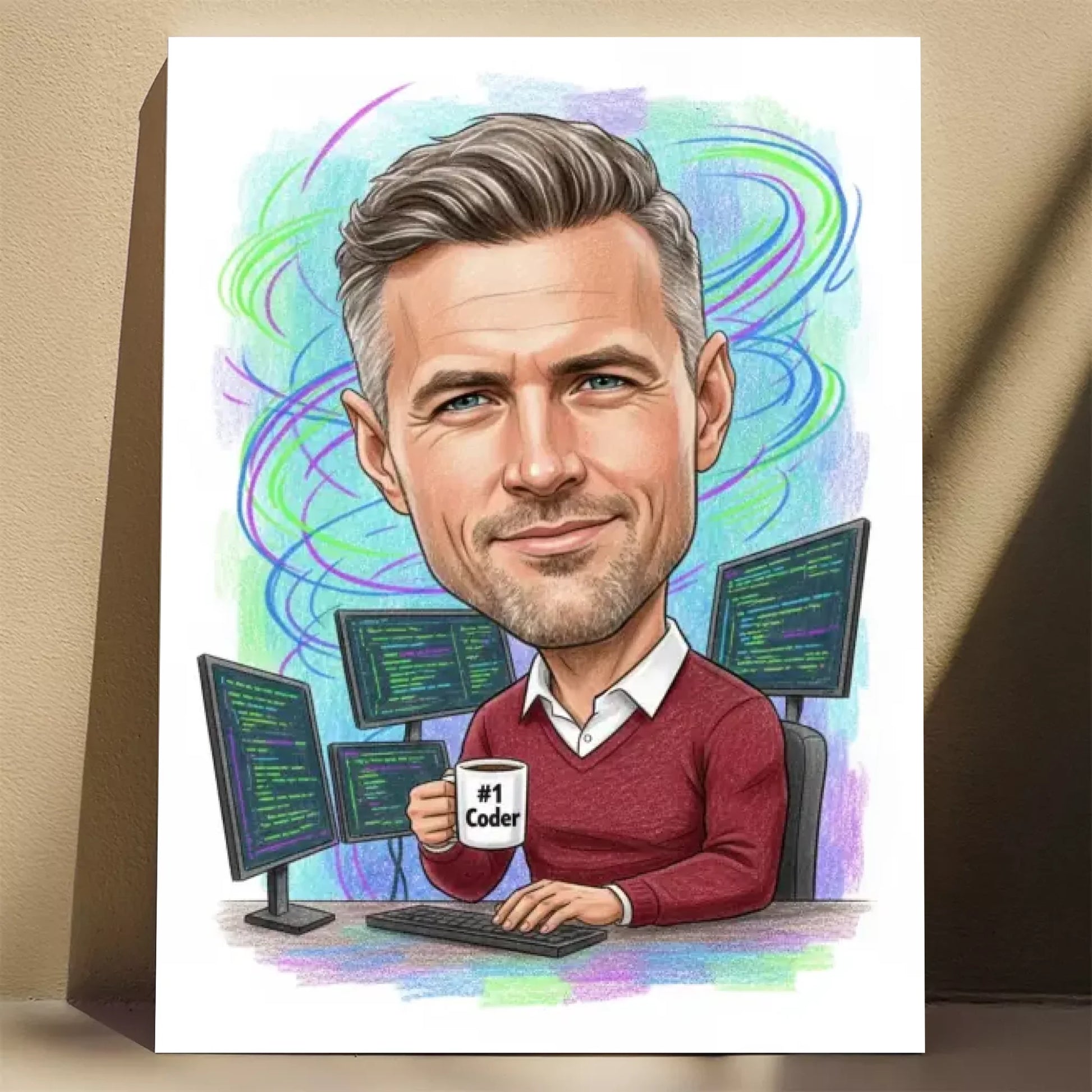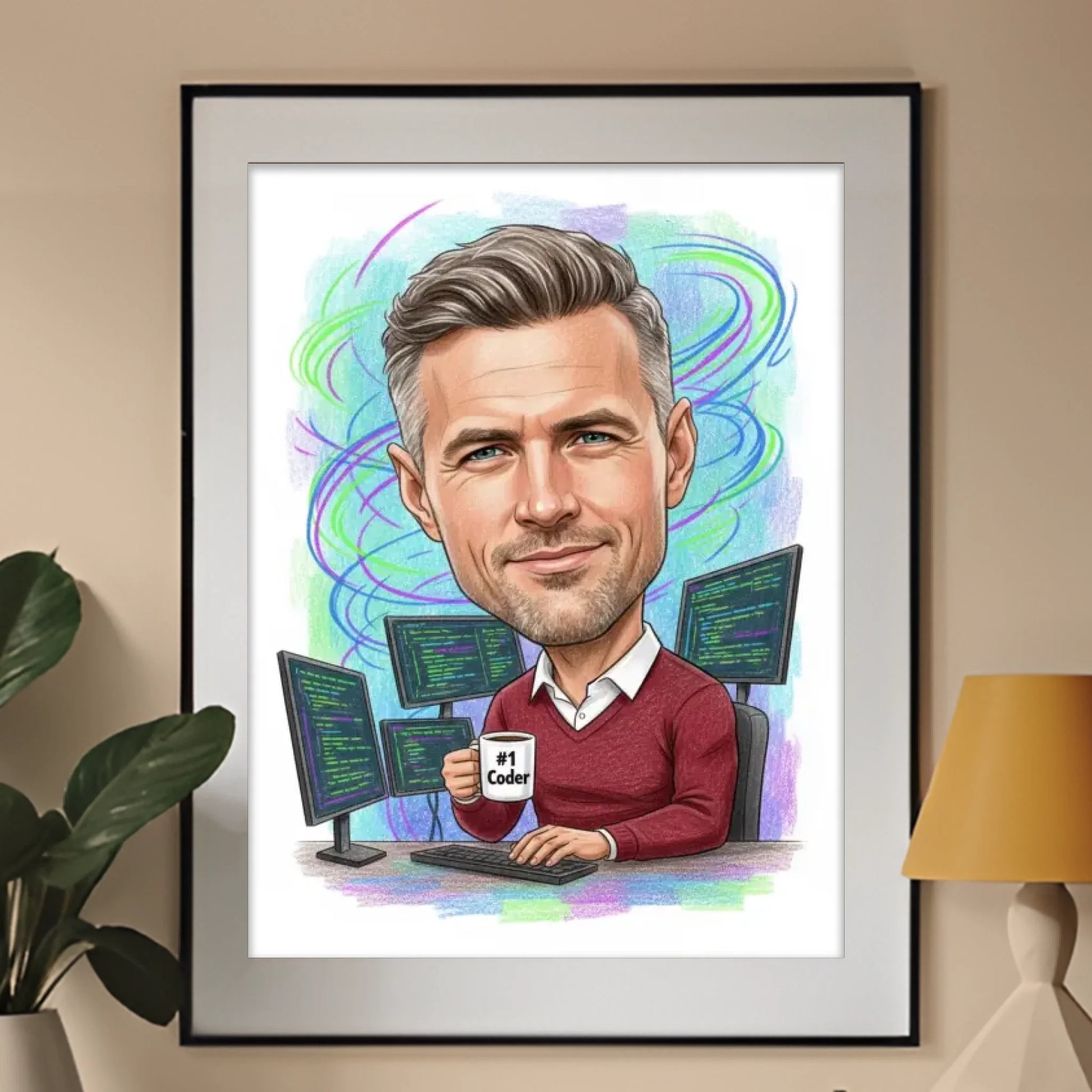 Karykatura „Programista” to cyfrowy portret tworzony ze zdjęcia – z humorem i nowoczesnym klimatem IT. 💻 Idealny prezent dla informatyka, developera lub fana kodu. Na karykaturze widoczny laptop, linijki kodu i kubek kawy – symbol pracy twórczej. Dodaj zdjęcie, zobacz podgląd LIVE i wybierz format: plakat, ramka lub płótno. Polska produkcja, ekspresowa wysyłka, gwarancja satysfakcji.